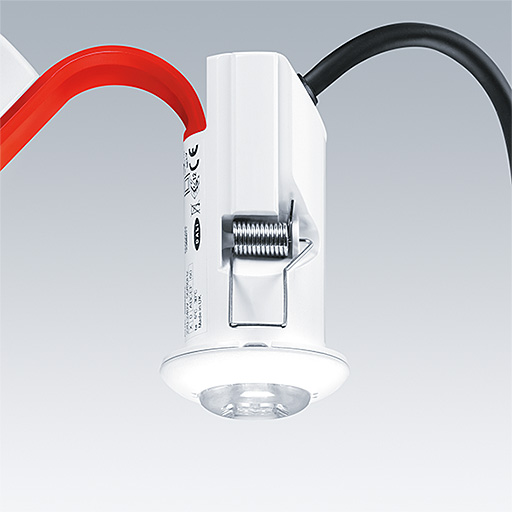 Self contained emergency luminaire for recessed or surface mounting in ceilings with interchangeable lenses for most flexible optimized illumination for escape, antipanic and spot lighting. Only 80 mm ceiling voids necessary for the recessed version and small dimensions for unobtrusive installation. Manual, selftest or selftest/addressable - version capability. Equipped with LiFePo battery technology.