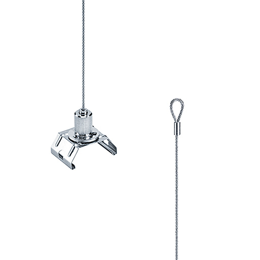 Cord suspension with loop (diameter: 6 mm) for connecting trunking without tools using CLIX technology. Fixing clips made of V2A rust-proof spring steel. Cord made of galvanised steel. Continuous height adjustment. Cord can be cut to length. Maximum load: 30kg. Dimensions of fixing clip: 28 x 42 x 9 mm.