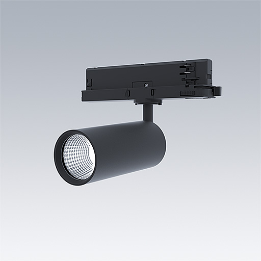 LED spotlight for 3 phase track installations with spot light distribution and stabilized color temperature. Electronic, fixed output control gear. Class II electrical, IP20. Body: Die-cast aluminium black micro-textured paint. Reflector: PC sputtered. Spotlight rotatable through 360° and pivotable through 90°. Complete with 4000K LED