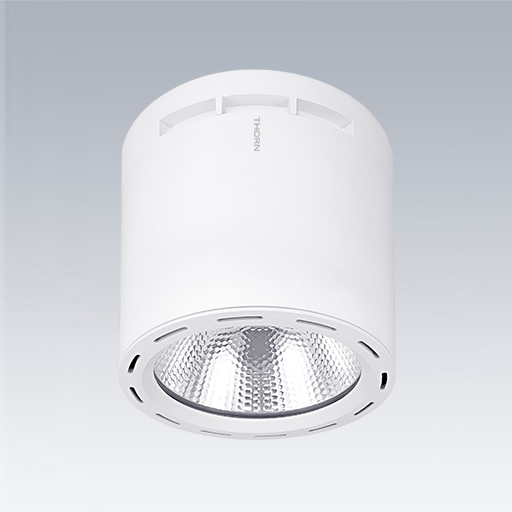 Highly efficient integrated LED surface-mounted downlight with lens and anti-glare reflector provides harmonious light. A surface mounted LED luminaire. On-off control gear Class I electrical, IP65, Impact strength: IK06. Body: aluminium, white (RAL9003). Can be suspended by using wire suspension and rope suspension accessory kits (to be ordered separately). Colour rendering Ra > 80, colour temperature 4000K.