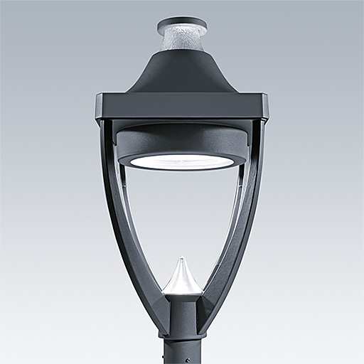 A modern heritage post top LED lantern with Narrow Road closed optic. Electronic. Class II electrical, IP65, IK08. Body: Die-cast aluminium powder coated grey 900 textured finish (close to RAL 7043). Enclosure: flat toughened glass. Surge protection: 10kV single pulse common mode and 8kV multipulse common mode and 6kV multipulse differential mode. If permanent DALI system is connected, 6kV multipulse common and differential mode. Complete with 3000K LED.
