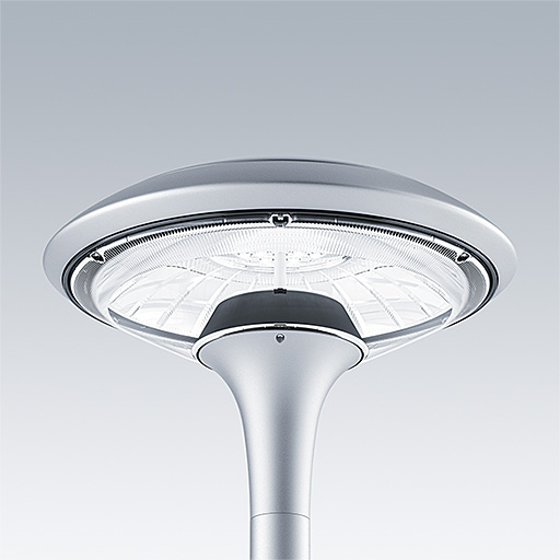 Plurio Direct: A decorative post-top LED lantern with radially symmetric distribution. LED driver with 18 LEDs driven at 500mA. Class I electrical, IP66, IK08. Base: cast aluminium, powder coated silver-grey. Canopy: disc shape, aluminium, textured silver-grey. Diffuser: UV stabilised, clear polycarbonate with anti-glare prisms. Direct, lens based optic with internal reflector. Equipped with 50% power reduction circuit, effective 3 hours before and 5 hours after a calculated midnight. It can be deactivated at installation with an easily accessible internal switch. Complete with 4000K LED. Post top mounting to Ø60mm column.