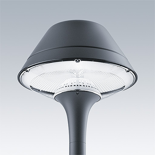 Plurio Indirect: A decorative post-top LED lantern with radially symmetric distribution. LED driver with 24 LEDs driven at 700mA. Class I electrical, IP66, IK08. Base: cast aluminium, powder coated anthracite (close to RAL7043). Canopy: original shape, aluminium, textured anthracite (close to RAL7043). Diffuser: UV stabilised, clear polycarbonate with anti-glare prisms. Indirect, reflector based optic. Complete with 2200-4000K NightTune LEDs. Post top mounting to Ø60mm column.