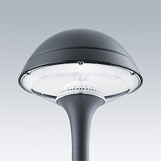 Plurio Indirect: A decorative post-top LED lantern with radially symmetric distribution. LED driver with 24 LEDs driven at 600mA. Class I electrical, IP66, IK08. Base: cast aluminium, powder coated anthracite (close to RAL7043). Canopy: round shape, aluminium, textured anthracite (close to RAL7043). Diffuser: UV stabilised, clear polycarbonate with anti-glare prisms. Indirect, reflector based optic. Equipped with 50% power reduction circuit, effective 3 hours before and 5 hours after a calculated midnight. It can be deactivated at installation with an easily accessible internal switch. Complete with 4000K LED. Post top mounting to Ø60mm column.