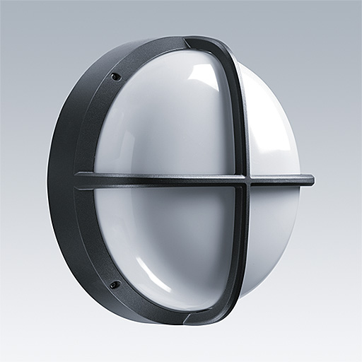 Round, impact resistant LED bulkhead luminaire. Electronic, fixed output control gear. Class I electrical, IP65, IK10. Body: large size, die-cast aluminium (LM6), powder coated anthracite. Diffuser: opal polycarbonate with die-cast aluminium cross feature. Electrical connection via 3 x 2 x 2.5mm² terminal block. Complete with 4000K LED