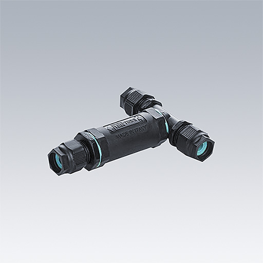 Connecteur en T à 3 pôles IP68, en plastique thermoformé PA66, résistant aux contraintes mécaniques et à la chaleur (-40°C/+125°C). Compatible avec une section de câble de 7 à 13,5 mm de diamètre. Section max. : 4 mm²