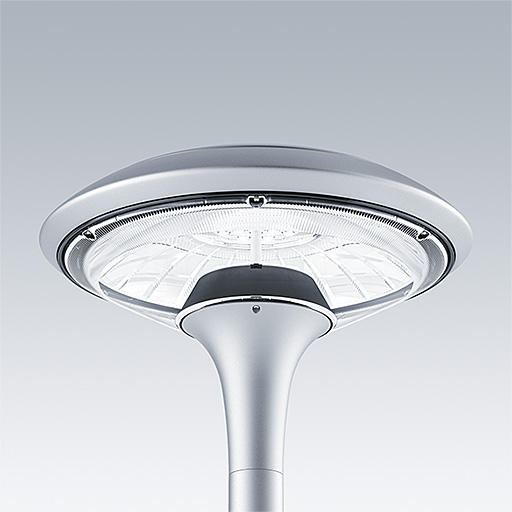 Plurio Direct : Lanterne LED décorative à montage top avec distribution Radialement symétrique. Driver avec 18 LED entraînés à 350mA. Classe électrique I, IP66, IK08. Base : coulé aluminium, thermopoudré gris argent. Chapeau : forme disque, aluminium, texturé gris argent. Diffuseur : anti-UV, transparent Polycarbonate (PC) avec prismes anti-éblouissement. Optique à lentille direct avec réflecteur interne Equipé d'un 50% circuit de réduction de puissance, qui entre en vigueur 3 heures avant et 5 heures après un minuit calculé. Il peut être désactivé à l'installation avec un interrupteur interne facilement accessible. Livré avec LED 4 000 K. Montage top sur mât de Ø 60mm.