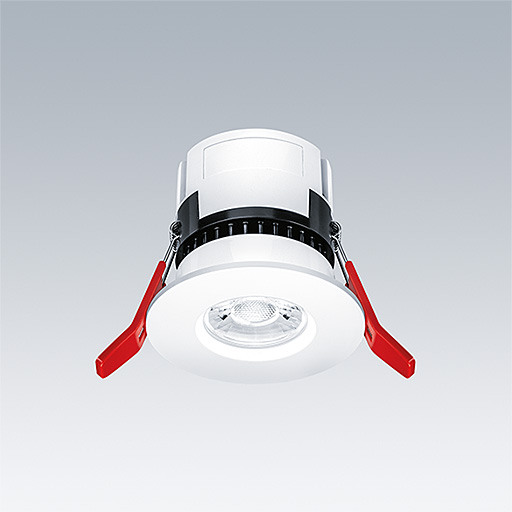 Mini downlight LED encastré. Driver intégré, adapté pour utilisation avec des gradateurs de phase standard. IP65 (IP65 par le dessous), IK04, Classe électrique II. Livré avec une optique à distribution large (48°) en PMMA, et collerette aluminium mat Moulage sous pression. Corps : acier avec dissipateur aluminium. Des clips à ressort permettent une installation sans outils dans des plafonds jusqu'à 25mm d'épaisseur et avec une découpe de Ø 74-80 mm. Câblage avec un connecteur détachable et un bornier à poussoirs avec repiquage possible. Livré avec LED 4 000 K.